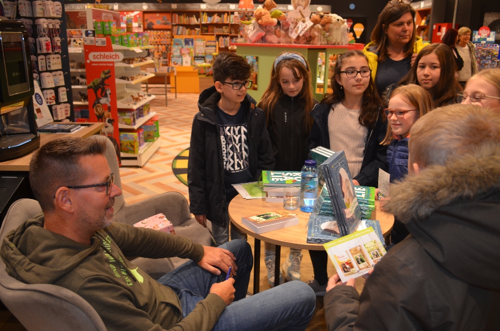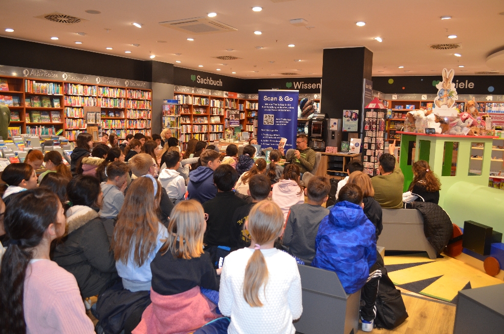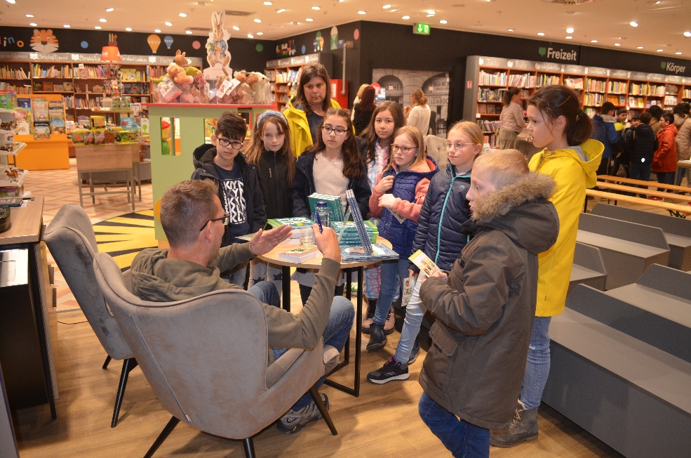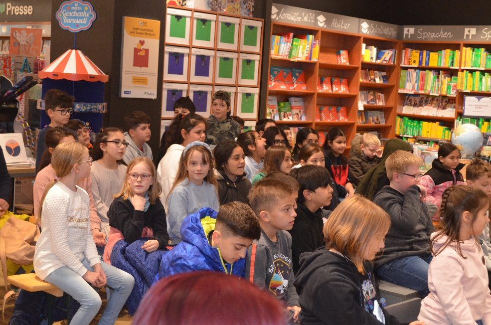 Am Dienstag, dem 25.04.2023, ging die Klasse 4c zur Buchhandlung Thalia. Der Autor Uwe Krauser las uns sein selbst geschriebenes Buch vor, „Rosalie, die Feuerwanze“. Er erwartete uns bereits. Zwei weitere Klassen waren auch dort. Dann kam der Autor. Er stellte uns seine anderen Bücher vor, sie hießen: „Phoebe, eine Straßenhündin checkt ein“, „Layla, Heldin auf vier Pfoten“, „Phoebe & Layla. Von Menschen, Möpsen und anderen Katastrophen“ und ein Bilderbuch, „Ein Hund ohne Namen“. Danach fing er an zu lesen. Die Geschichte fanden wir alle toll. Er konnte uns leider nicht die ganze Geschichte von Rosalie, der Feuerwanze vorlesen. Am Ende gab er uns Unterschriften und beantwortete uns Fragen. Von Thalia bekamen wir alle ein Buch geschenkt, „Volle Fahrt ins Abenteuer“. Die Zeit verging schnell, also mussten wir schon nach Hause gehen.