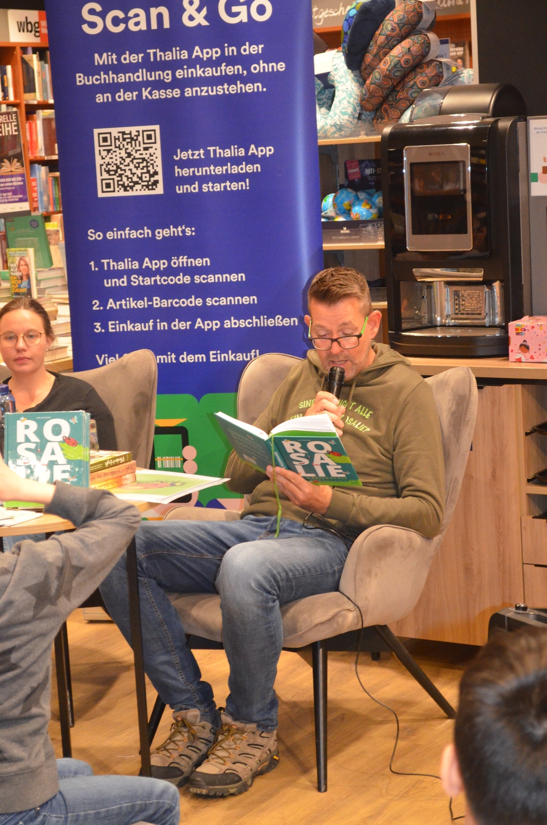 Am Dienstag, den 25.4.2023 machten wir uns auf den Weg nach Thalia. Frau Herzog hat uns begleitet. Als wir da waren, mussten wir kurz vor der Buchhandlung warten. Dann durften wir eintreten. Dort wartete bereits der Autor Uwe Krauser auf uns. Hinten, in der Kinderabteilung, wo auch die Lok steht, waren ein paar Bänke aufgestellt. Wir und noch eine andere Klasse nahmen dort Platz. Erst einmal hat er uns ein Bisschen was von sich erzählt. Dann fing er an und las uns etwas aus dem Buch vor. Der Titel des Buches war „Rosalie, die Feuerwanze“. Er zeigte uns manchmal Bilder dazu. Die andere Klasse war leider ein Bisschen laut. Uwe Krauser hat mit Mikrofon vorgelesen. Das Buch war wirklich toll. Er hat uns erklärt, dass er zwei Hunde hat. Sie heißen Phoebe und Layla. Ein Buch hat den Lesepreis gewonnen. Nach dem Vorlesen ist unsere Klasse zu ihm gegangen und hat mit ihm ein Bisschen geredet. Dabei haben wir erfahren, dass er in einem kleinen Dorf in Bayern wohnt, aber aus Remscheid kommt. Danach haben wir Autogrammkarten bekommen und Herr Krauser hat sie signiert. Dann mussten wir leider schon gehen. Es waren tolle und interessante Stunden in der Buchhandlung. Der Ausflug hat viel Spaß gemacht.