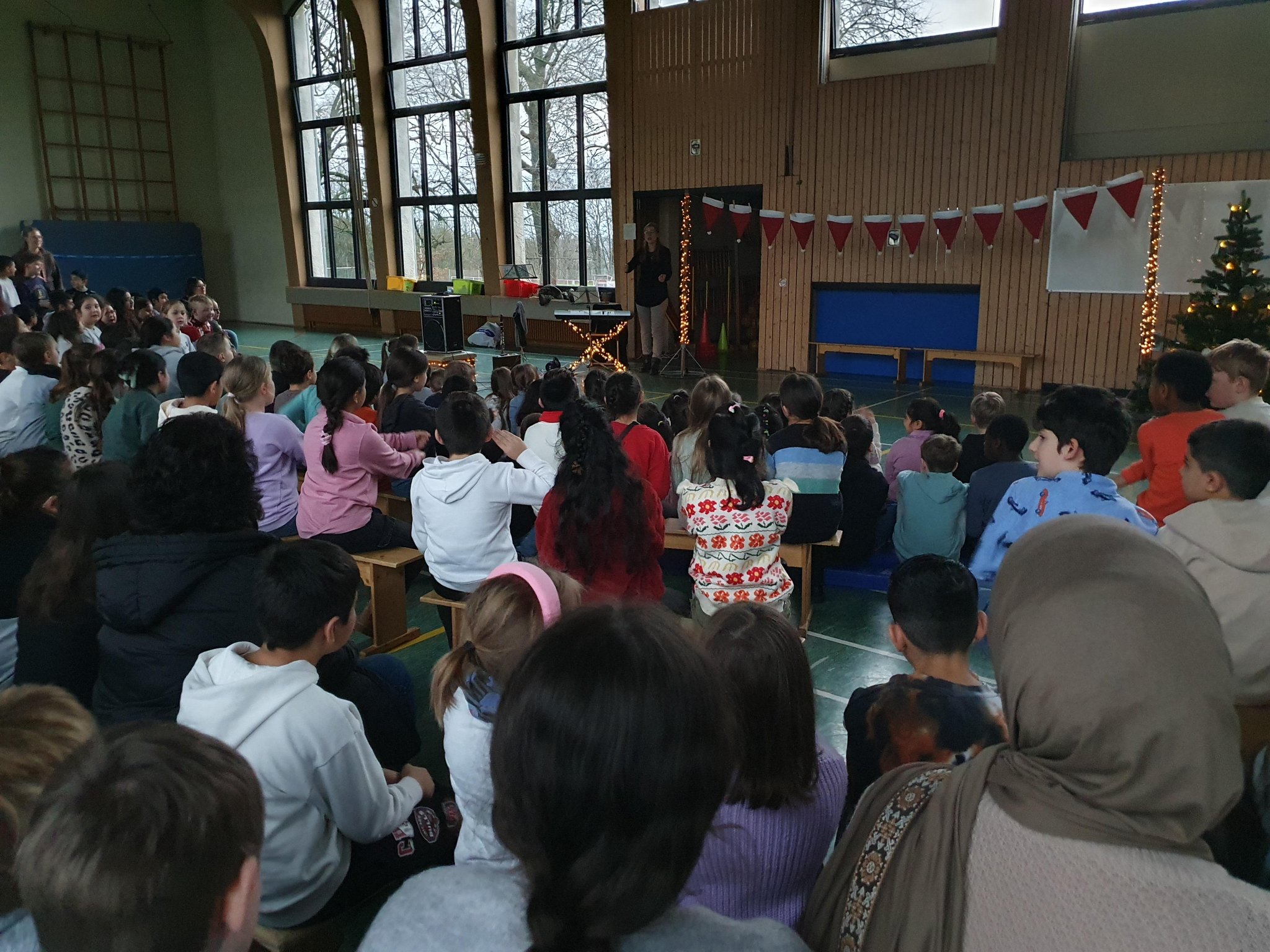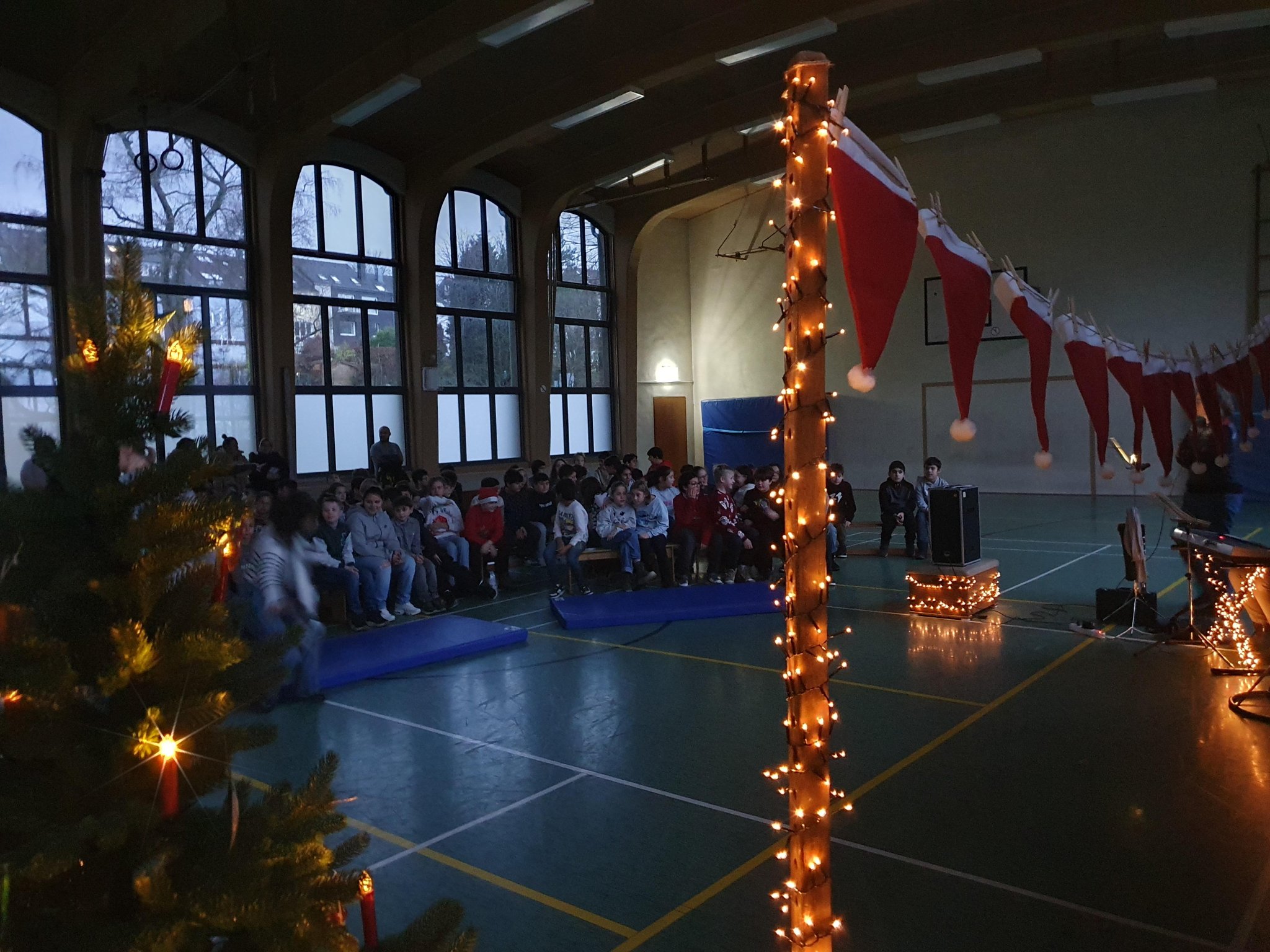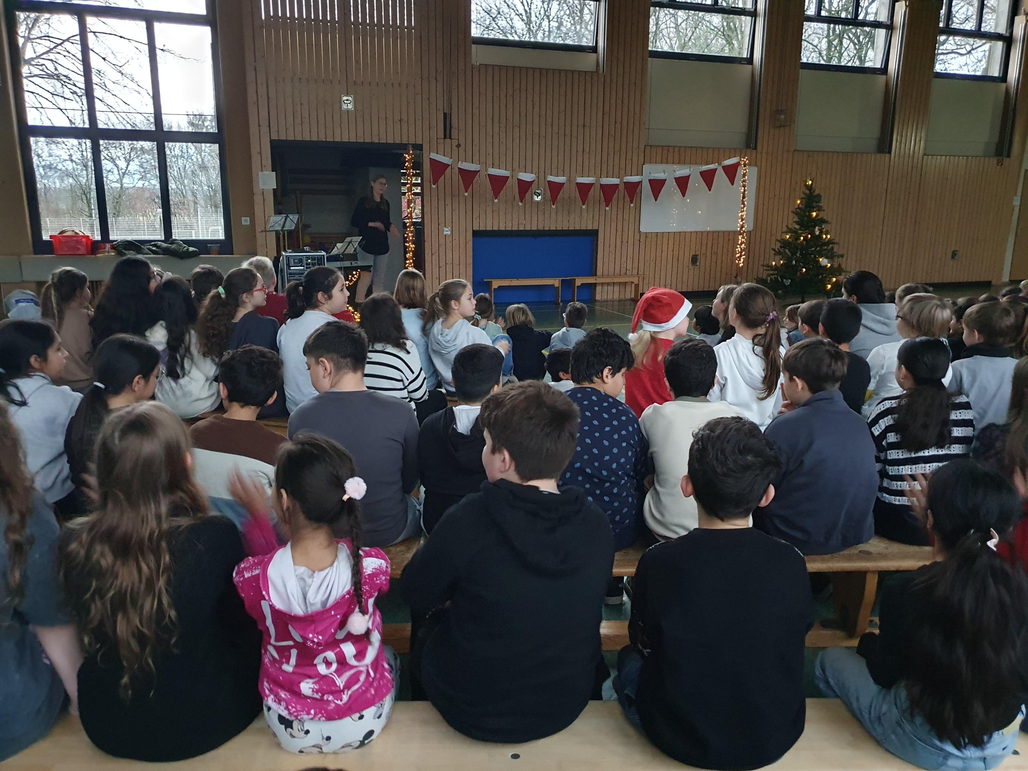 Zur Einstimmung auf die Weihnachtsferien haben sich am vorletzten Schultag alle Dritt- und Viertklässler*innen in der noch dunklen Turnhalle versammelt, um gemeinsam Lieder zu singen und sich kleine Vorführungen aller Klassen anzuschauen. Schön, dass auch einige Eltern den Weg in die Turnhalle gefunden hatten! Beim Singen wurden wir durch Klarinette (Frau Nüsken) und Klavier (Frau Danilow) begleitet, was sich dadurch sehr schön anhörte. Danke dafür und danke auch an alle Klassen, die sich auf diese Feier so gut vorbereitet hatten.