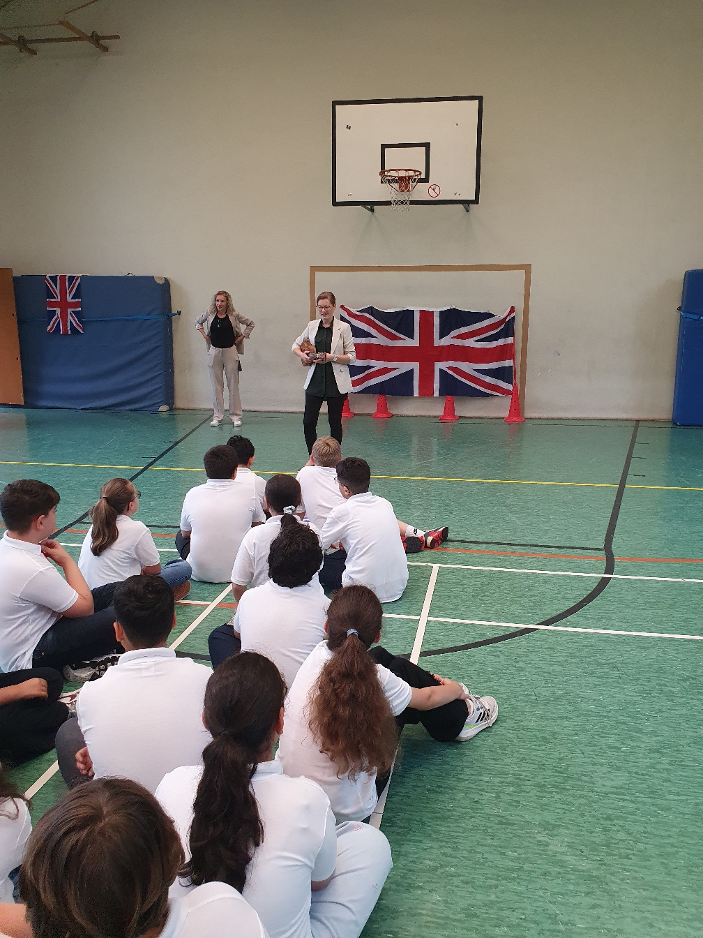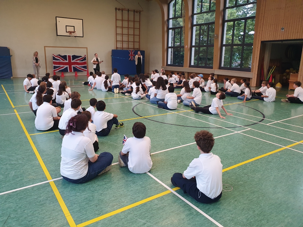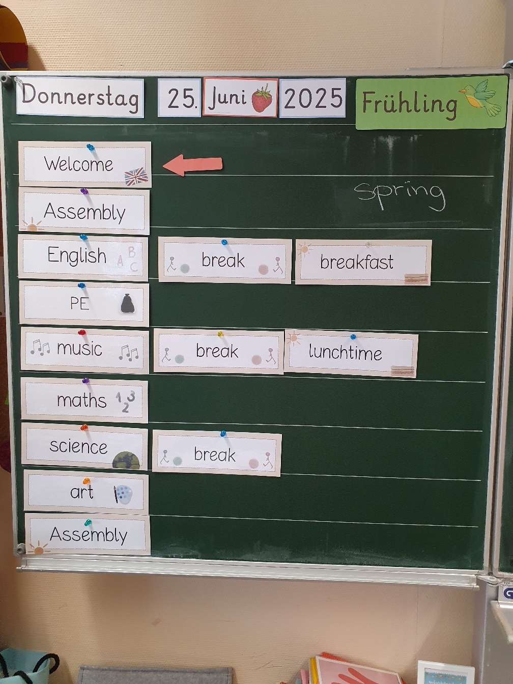 Heute fand an der GGS Am Stadtpark der jährlich stattfindende Englischtag statt. Mit dunkler Hose oder Rock, weißem Poloshirt und roter Krawatte bekleidet, startete der lange Schultag mit der "Assembly", der Zusammenkunft aller Beteiligten, die bei uns in der Turnhalle stattfand. Danach wurden alle Unterrichtsfächer in englischer Sprache abgehalten: Mathe, Sport, Sachunterricht, Kunst, Musik - überall ging es inhaltlich um das Wetter. Toll, dass alle schon so viel verstehen können! Mittags gab es klassisches englisches Essen: Fish & Chips.