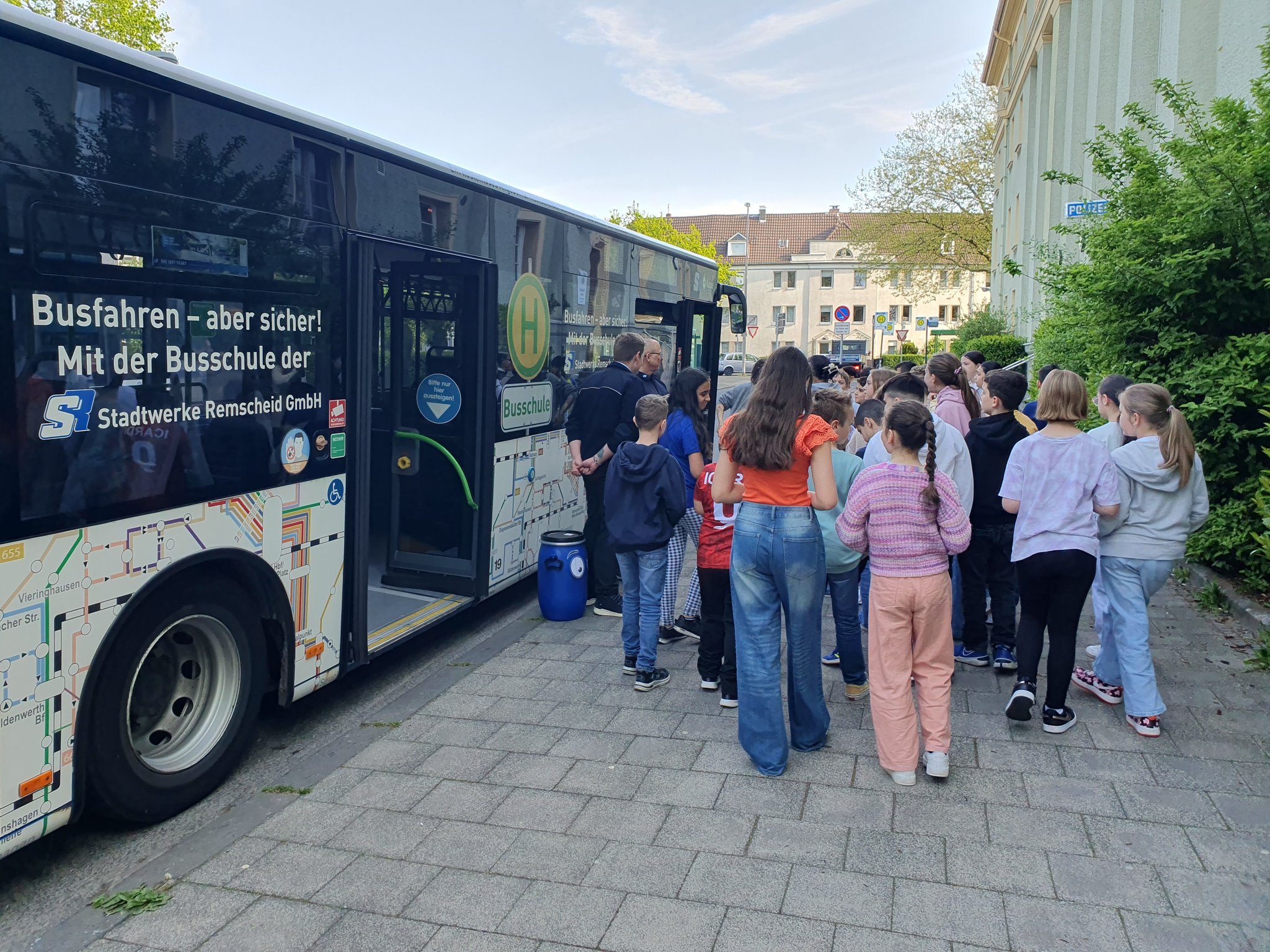 Am Dienstag waren die Kinder der 4. Klassen mit dem Bus unterwegs – ganz ohne Fahrkarte und das völlig legal! Das lag daran, dass sie von den Stadtwerken Remscheid zur so genannten „Busschule“